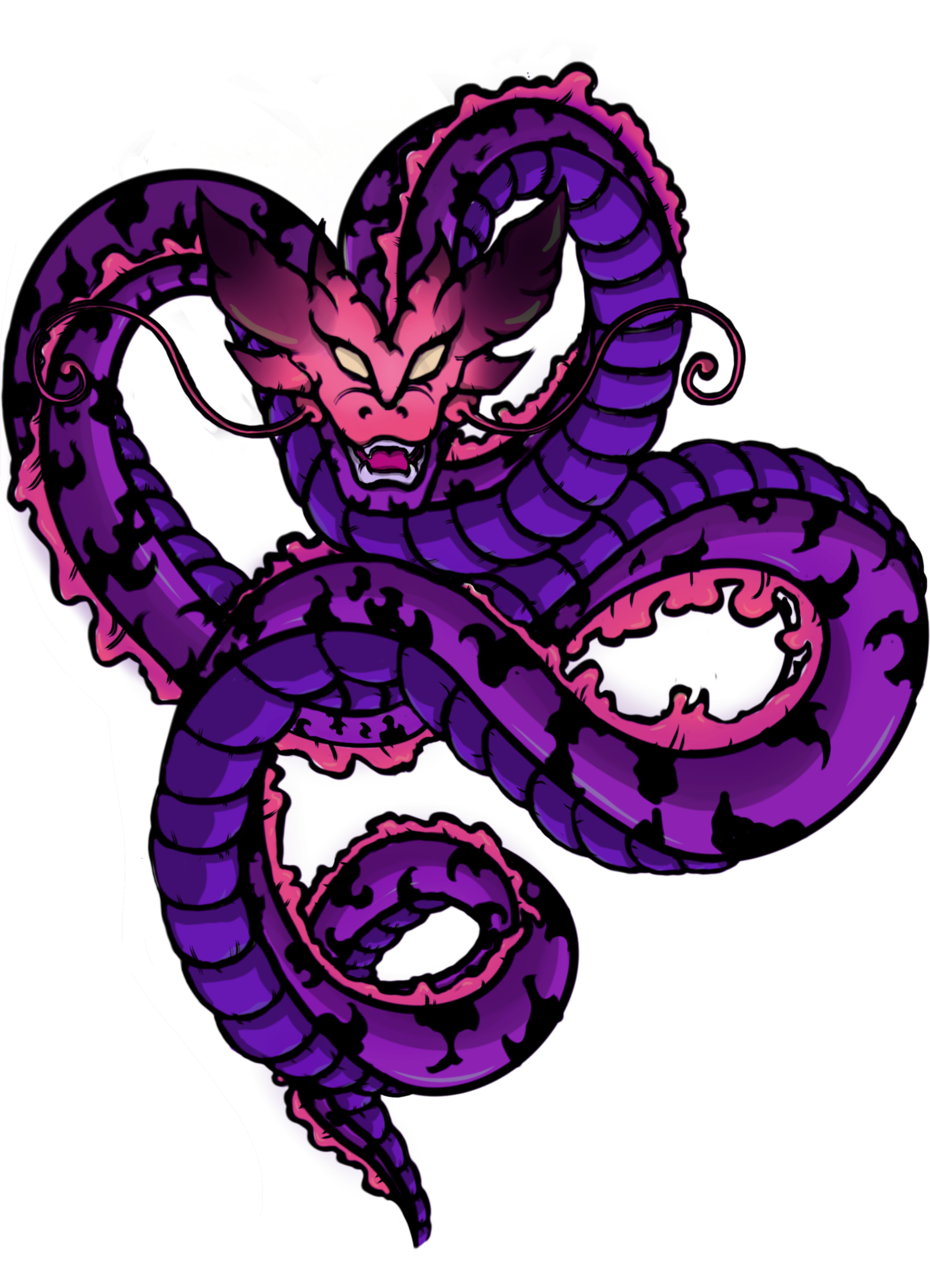 Draeos, like many other Eternal Dragons resembles that of a traditional four-toed Chinese dragon but with some starch differences. Unlike that of Shenron, Draeos is completely serpent-like, not even possessing limbs such as hands or wings. Her body is mainly comprised of purple scales with a black flame-like pattern scattered about her back as well as pink fringes along the center. Upon her head are 6 horn shaped protrusions that become darker the further away from their origin it extends, sharp fangs, pale golden eyes, light purple whiskers that extend from her cheeks, and large crescent-shaped nostrils.